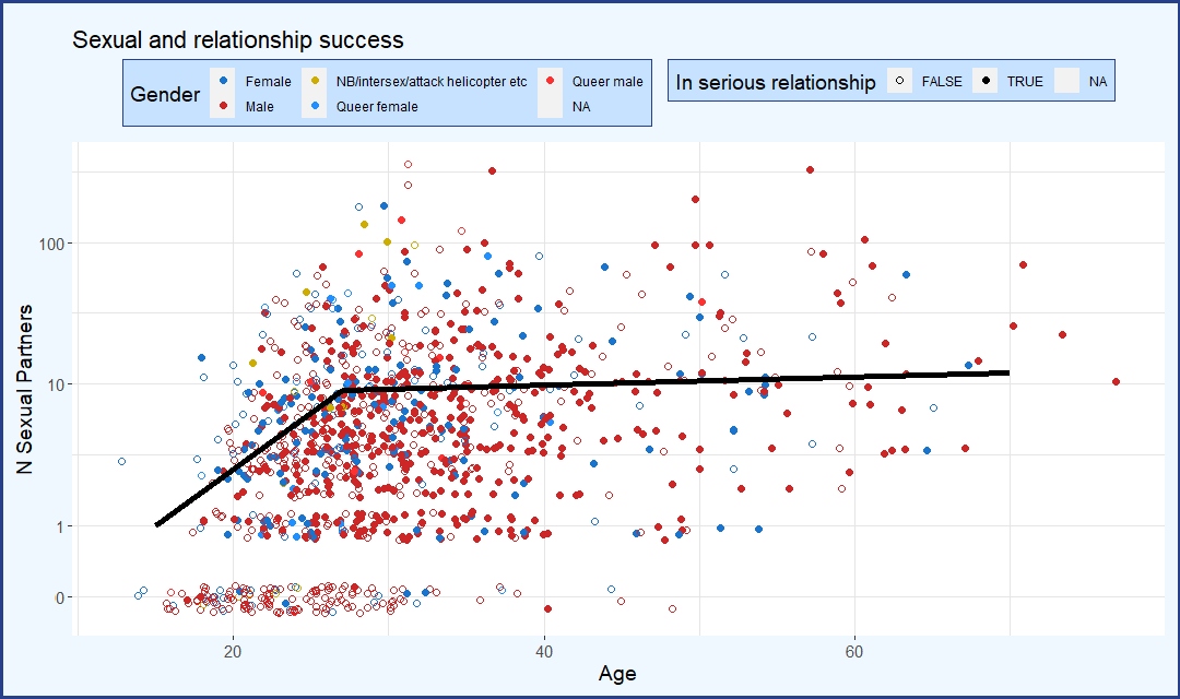 I have a question about the sexual and relationship success chart. There are dots that jitter around the 0-line. Surely, N Sexual partners is either 0 or some positive integer. Is there noise added to prevent deanonymization or why is it that way?