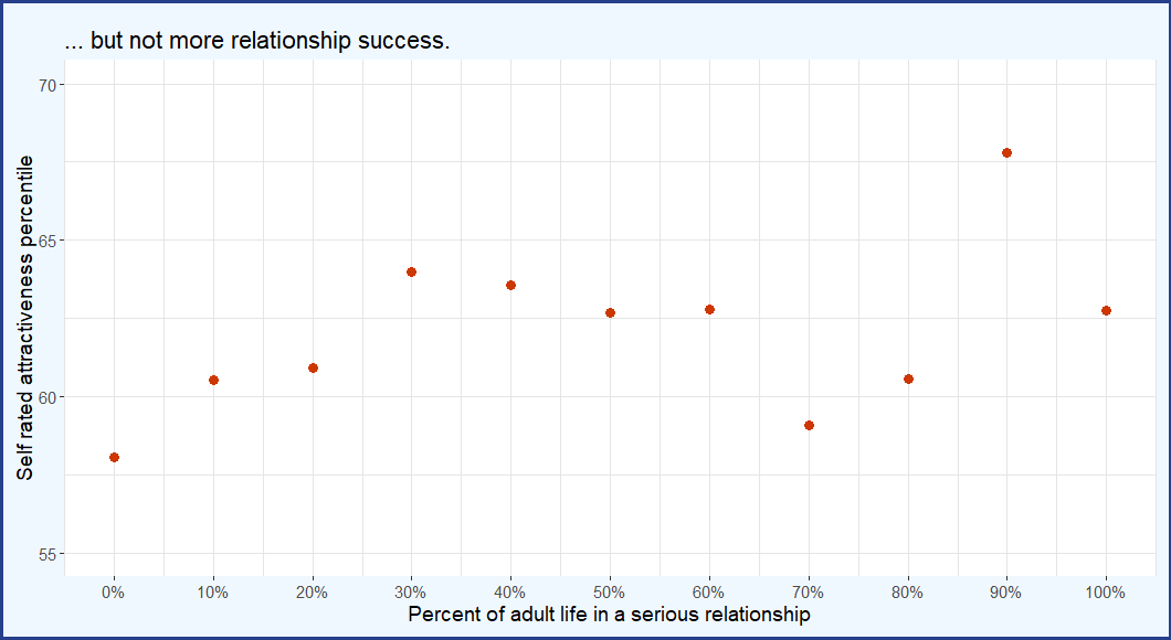 For long-term success, I wanted to combine the questions on current relationship status and overall percent of time in relationships. Looking at a bunch of data like this, it seems that married people should expect 20 more years of marriage and single people should expect to stay unmarried for another 12. I decided to err on the conservative side and just add 15 years of “being in a serious relationship” to those currently in one for the purpose of calculating % of time romantically engaged. So a 33-year who spent half the time since age 18 in a relationship (7.5 years) but is now in a serious one will have that metric upgraded to 75%, since I assume their next 15 will be in a relationship as well.