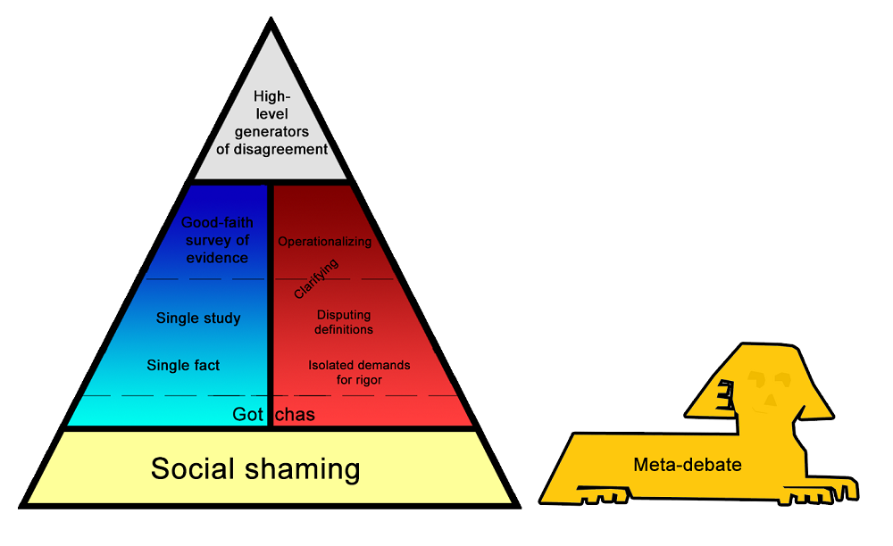 At the top of Scott’s pyramid are generators of disagreement that cannot be resolved with a simple double crux, like heuristics built up of countless bits of evidence and aesthetic disagreements. This is where Nameless comes in.