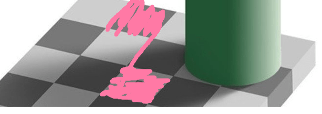1. Priors: change your perception to match your model of reality. For example, you know that shadows make things appear darker and so your mind perceives square A to be darker than B in the picture below.