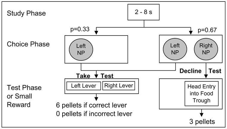 Five rats rarely declined to take the duration test (M = 97.8%, SEM = ± .01%). The performance for these five rats was likely due to response bias as it appears that these rats failed to learn the experimental contingency of the nose-poke apertures. As a result, these five rats did not provide evidence for or against metacognition.